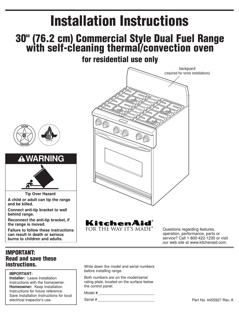 Empower your creativity with a 30-inch KitchenAid Commercial Style Range with 4 burners. KDRS807SSS - 30 Inch Dual Fuel Range ranges pdf manual download. Installation Instructions Manual KitchenAid DUALFUEL RANGES Installation Instructions Manual 40 pages 30 762 CM FREESTANDING AND SLIDE-IN DUAL FUEL RANGES.